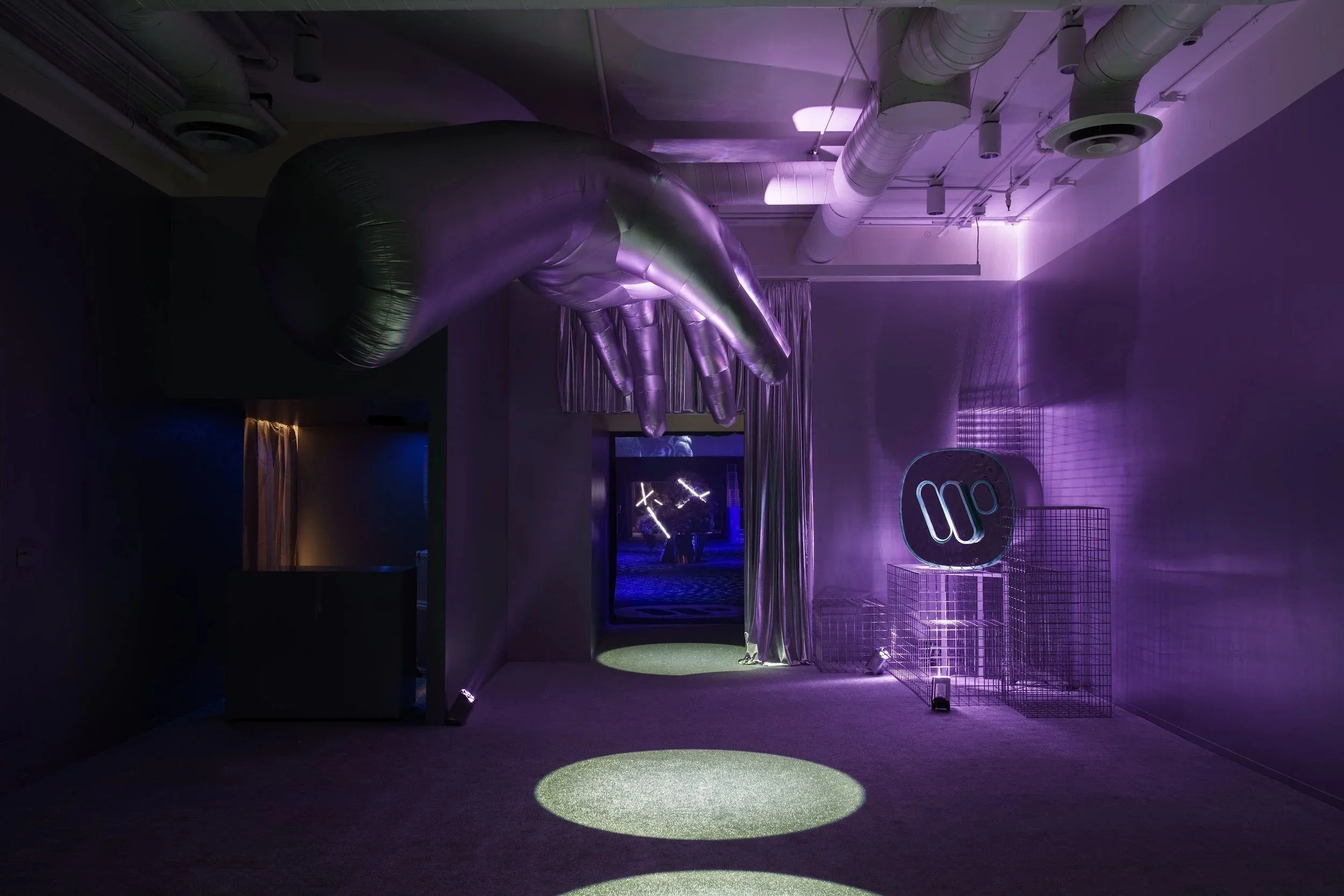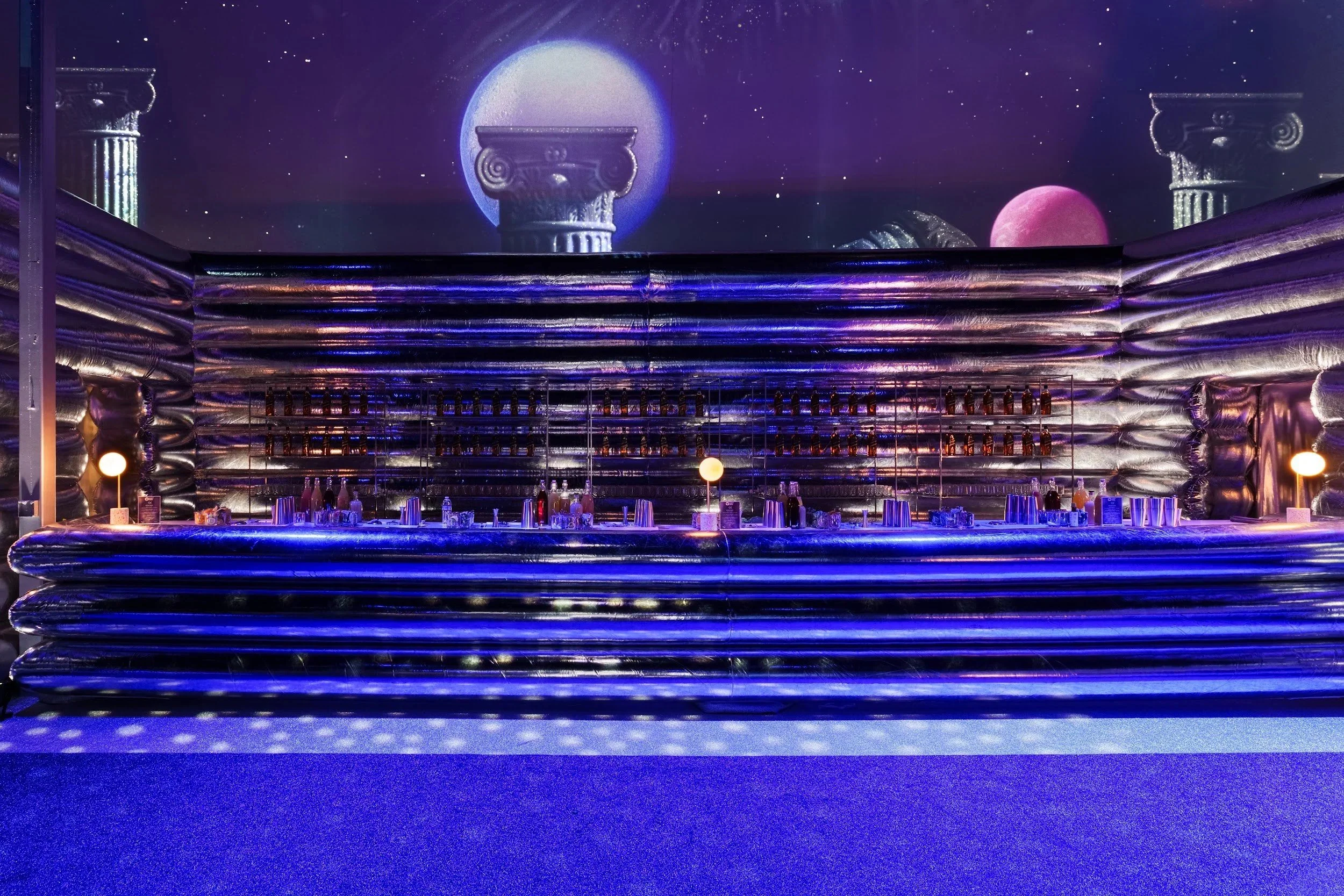 Inside, our versatile venue was reimagined as a futuristic disco dreamscape. The space was bathed in a navy blue and silver palette, with projections of space-age patterns and mythic architecture dancing across the walls. In a striking symbol of artistic ascent and reinvention, a massive silver Pegasus was suspended over the dance floor in place of a traditional mirror ball.